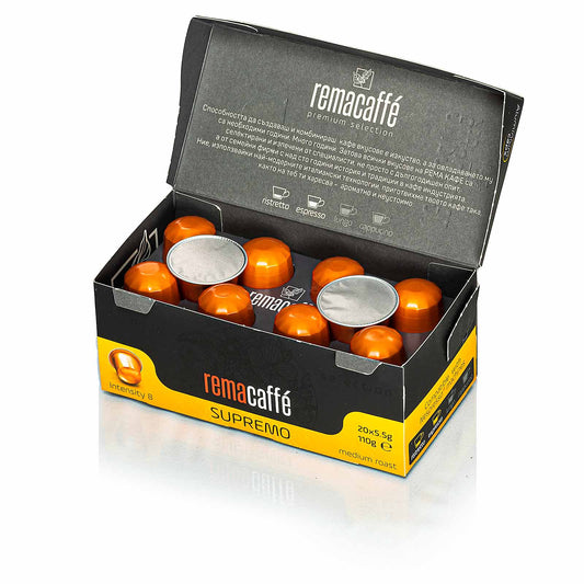 капсули REMACAFFE Supremo, 20 бр., съвместими с кафемашини NespressoОбичайна цена 22.90 лв / 11.71 €Обичайна цена 22.90 лв / 11.71 € Цена при разпродажбаЕдинична цена за22.90 лв