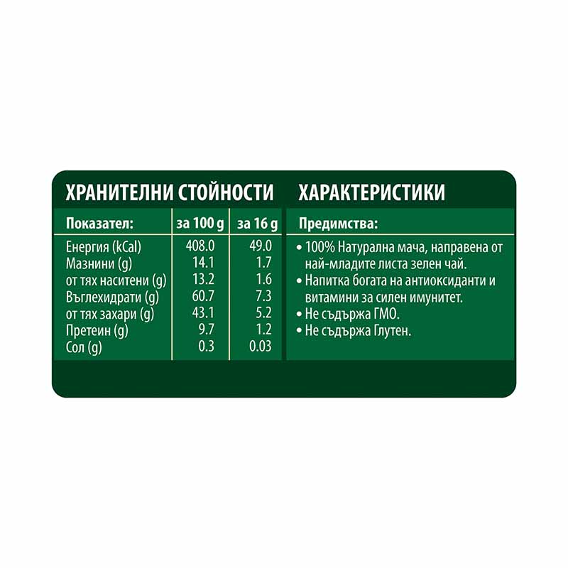 •  100% Натурални листа зелен чай и нежно разтворимо мляко